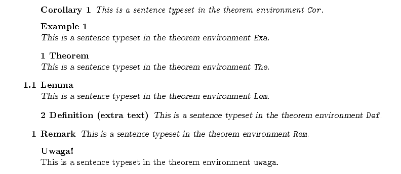 \theoremstyle{plain} \newtheorem{Cor}{Corollary} \theoremheaderfont{\normalfont\bfseries} \theorembodyfont{\normalfont\slshape} \theoremstyle{break} \newtheorem{Exa}{Example} \theoremstyle{changebreak} \newtheorem{The}{Theorem} \theoremstyle{marginbreak} \newtheorem{Lem}{Lemma}[The] \theoremstyle{change} \newtheorem{Def}[The]{Definition} \theoremstyle{margin} \newtheorem{Rem}{Remark} \theoremstyle{nonumber} \newtheorem{uwaga}{Uwaga !} \begin{Cor} This is a sentence typeset in the theorem environment Cor. \end{Cor} \begin{Exa} This is a sentence typeset in the theorem environment Exa. \end{Exa} \begin{The} This is a sentence typeset in the theorem environment The. \end{The} \begin{Lem} This is a sentence typeset in the theorem environment Lem. \end{Lem} \begin{Def}[extra text] This is a sentence typeset in the theorem environment Def. \end{Def} \begin{Rem} This is a sentence typeset in the theorem environment Rem. \end{Rem} \begin{uwaga} This is a sentence typeset in the theorem environment uwaga. \end{uwaga}